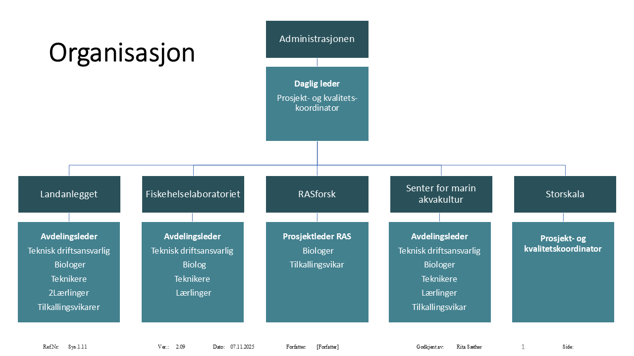 Administrasjonen består av daglig leder, administrativ koordinator, og prosjekt- og kvalitetskoordinator. Administrasjonen har kontorsted ved Landanlegget. Havbruksstasjonen er delt opp i fire ulike avdelinger; Landanlegget, Fiskehelselaboratoriet, RASforsk og Senter for marin akvakultur. Hver av våre fire avdelinger har avdelingsleder, teknisk driftsansvarlig og en stab av forsøksteknikere og teknikere.